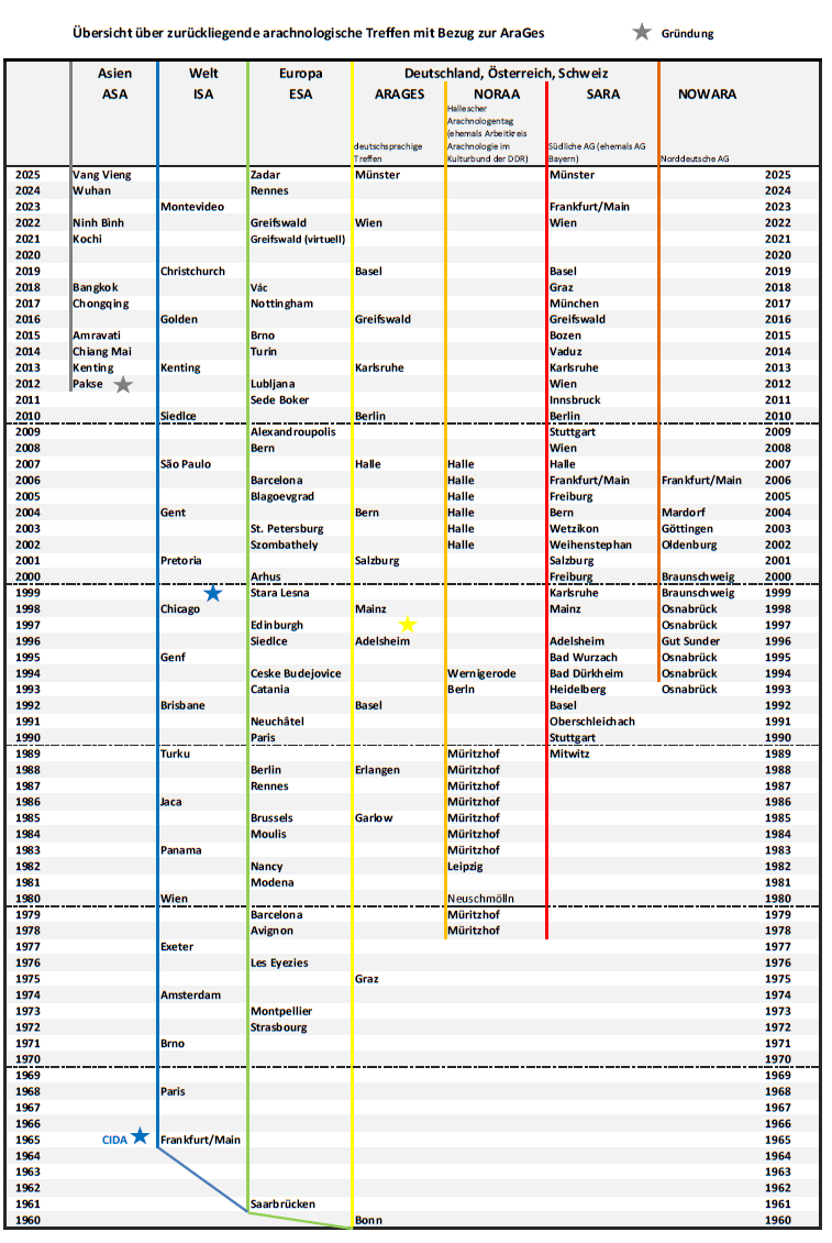 Schon 1960 organisierten Ernst Kullmann und Wolfgang Crome ein erstes Treffen deutscher Arachnologen am Rande der Jahresversammlung der Deutschen Zoologischen Gesellschaft in Bonn. Bis zur Gründung der AraGes folgten vier weitere Treffen. Die Arachnologischen Mitteilungen erschienen zum ersten Mal im August 1991 als Publikation der Arachnologischen Arbeitsgemeinschaften Deutschlands.